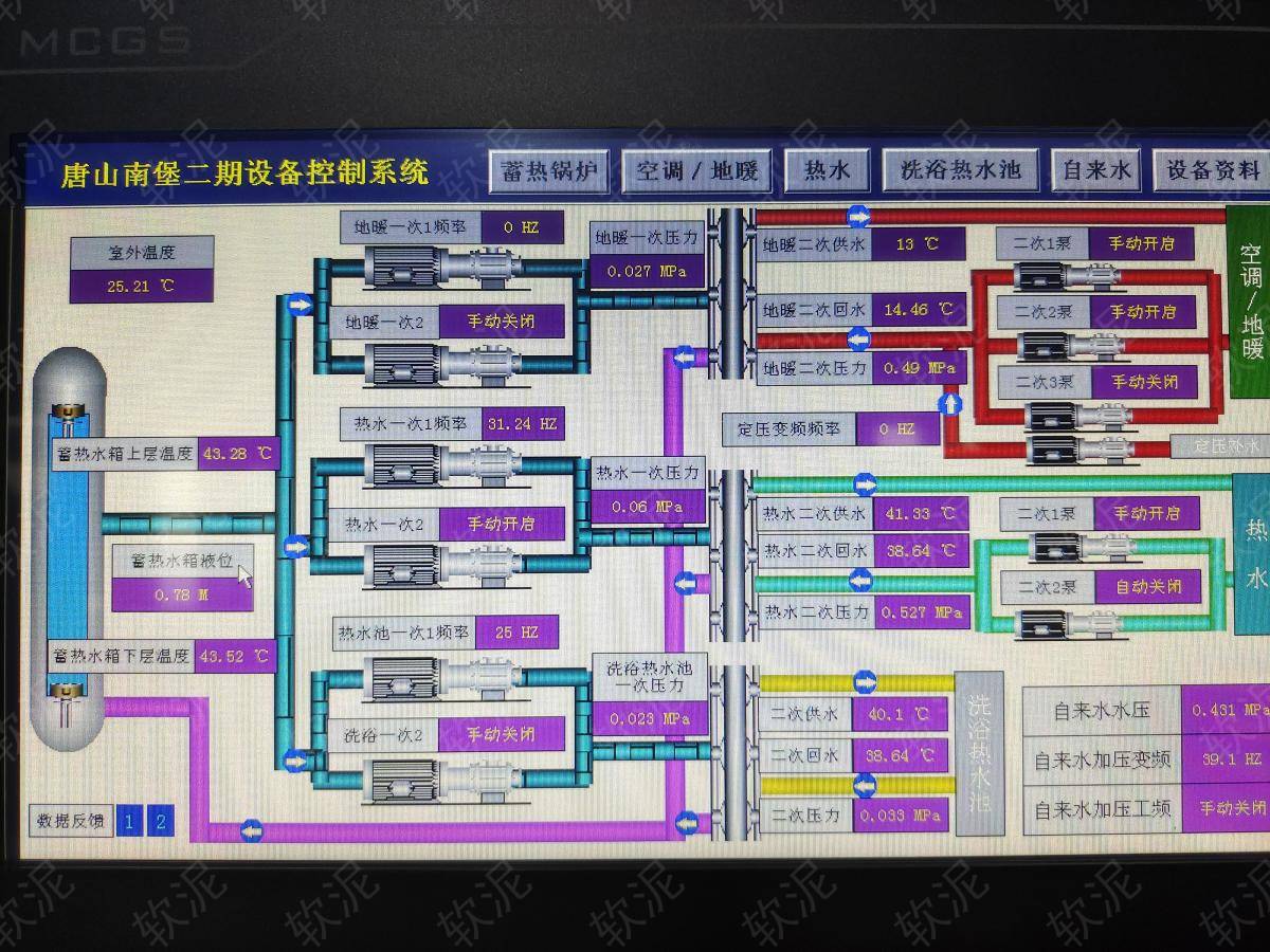 | 1. 項(xiàng)目位于唐山市曹妃甸區(qū),北堡村附近。冷水自來水加壓泵,變頻調(diào)速維持水壓恒定。熱水通過板式換熱器獲得蓄熱水箱的熱能,維持恒溫。 2. 給大水箱蓄熱到恒定溫度,溫度不足時(shí)自動(dòng)啟動(dòng)加熱管(當(dāng)?shù)仉妰r(jià)統(tǒng)一,沒有峰谷電價(jià)) 3. 制冷時(shí)使用空調(diào)直接對(duì)二次網(wǎng)降溫。制熱時(shí)二次網(wǎng)水泵不間斷運(yùn)行,一次網(wǎng)水泵通過間歇運(yùn)行給板式換熱器維持恒定溫度,從蓄熱水箱獲取熱源。 4. 所有傳感器和設(shè)備運(yùn)行數(shù)據(jù)接入軟泥物聯(lián)網(wǎng)系統(tǒng),自動(dòng)運(yùn)行,機(jī)房無人值守,通過手機(jī)軟件可隨時(shí)查看設(shè)備運(yùn)行情況。 |
