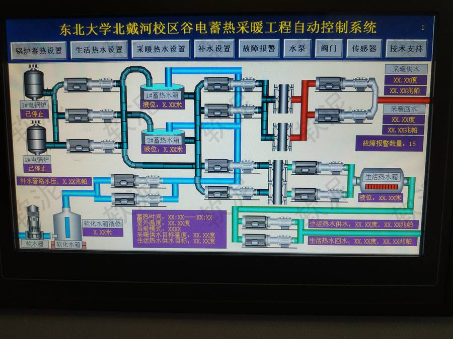 | 項(xiàng)目位于河北省秦皇島市北戴河區(qū)濱海大道54號(hào)。谷電價(jià)期間給兩個(gè)大水箱加熱,白天內(nèi)網(wǎng)循環(huán)給供暖系統(tǒng)和生活熱水系統(tǒng)。項(xiàng)目共計(jì)控制15臺(tái)變頻器、20個(gè)電動(dòng)閥門(mén)、15個(gè)溫度傳感器、5個(gè)壓力傳感器、4個(gè)液位傳感器,可根據(jù)預(yù)設(shè)方案自動(dòng)運(yùn)行。使用軟泥智能控制主機(jī)的4G聯(lián)網(wǎng)控制功能,管理人員通過(guò)手機(jī)即可遠(yuǎn)程查看設(shè)備運(yùn)行狀態(tài),設(shè)定自動(dòng)運(yùn)行的各項(xiàng)控制需求。 |