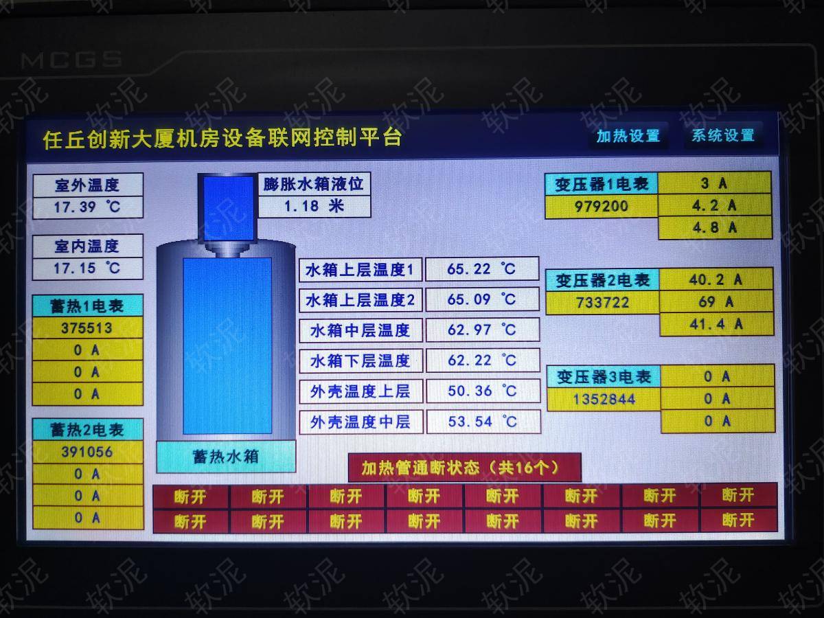 | 1. 項(xiàng)目位于任丘市創(chuàng)新大廈地下機(jī)房,創(chuàng)新大廈A座和B座同時使用蓄熱設(shè)備,冬季供暖系統(tǒng),夜間谷電價期間給大水箱蓄熱,二次網(wǎng)循環(huán)泵始終運(yùn)行,一次網(wǎng)循環(huán)泵通過間歇運(yùn)行,給板式換熱器升溫,維持二次網(wǎng)恒定溫度。白天不蓄熱,只釋放存儲的熱能,節(jié)約電費(fèi)。 2. 現(xiàn)場沒有人值班,通過手機(jī)軟件隨時可查傳感器數(shù)據(jù),設(shè)備運(yùn)行期間根據(jù)反饋電流可確認(rèn)設(shè)備正常工作,無需到現(xiàn)場核對。設(shè)備超時無應(yīng)答會有明顯提示。 3. 自動模式根據(jù)設(shè)定參數(shù)自動啟停。手動模式直接啟停每個設(shè)備用于調(diào)試檢修。 |